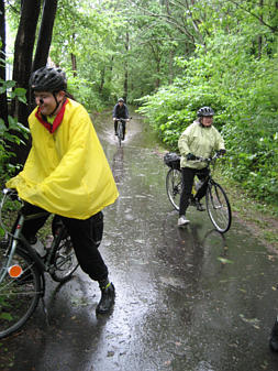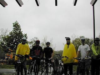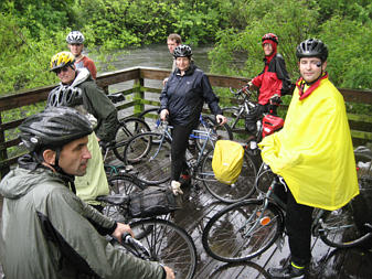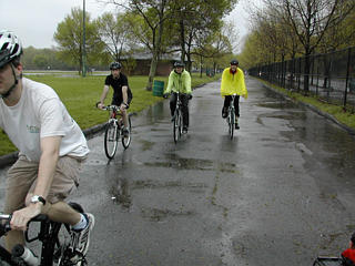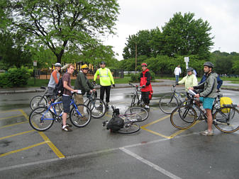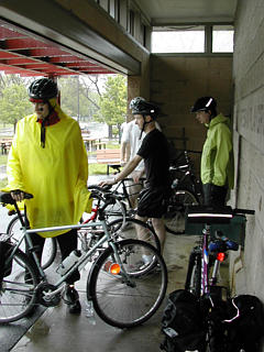 Cyclists seeking shelter from rain before "Bike the Charles" |