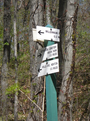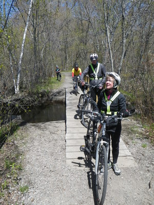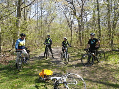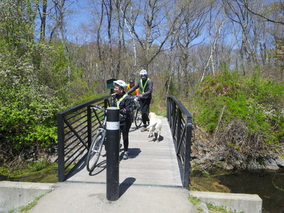 To kick off Bike Month, the Boston Natural Areas Network sponsored a bike tour of the urban wilds of West Roxbury. It was a gorgeous day, and we visited some wonderful places: Bellevue Hill, Hancock Woods, Leatherbee Woods, Brook Farm, Millenium Park, Rivermoor, and the right-of-way of the former Providence Secondary Line that could have been a nice rail trail across the neighborhod until it was sold off to abutters by the state. All of the other riders came from south of the Neponset River, Quincy and Milton, and I extended the ride to take most of them on my favorite bike path through Stony Brook Reservation on their way home.