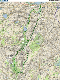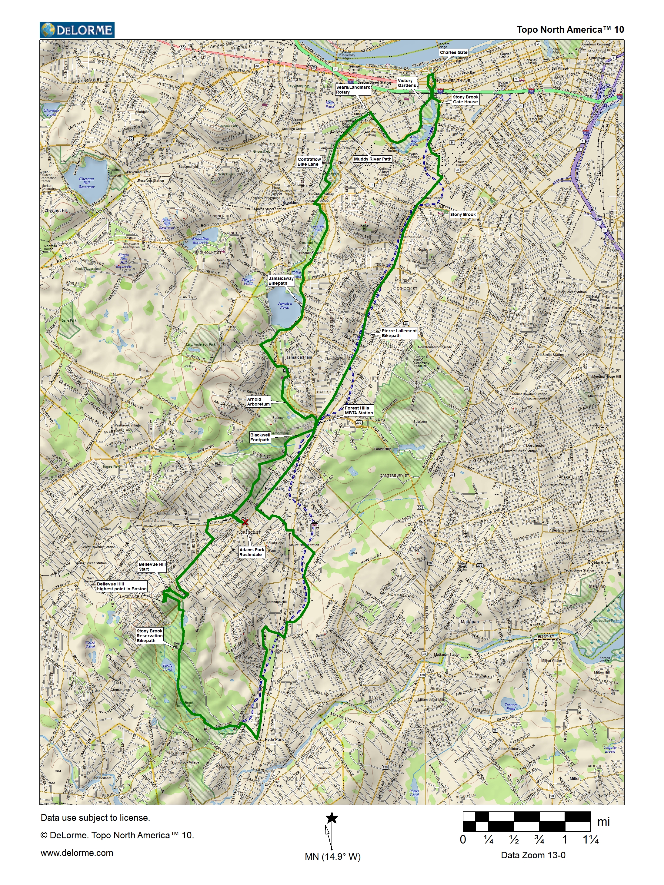 Photos of the 2013, 2010, and2007 RidesGetting To the StartAdams Park in Roslindale Square, the center of a triangular rotary formed by the intersections of Washington, Poplar, Corinth, and South Streets. Cummins Highway, coming from the east, dead ends into the park, too. It is about one mile south of the Forest Hills Orange Line MBTA station.Bellevue Hill is above the highest point on Washington St., about a mile south of Roslindale Square (and a couple of hundred feet higher). The West Roxbury and Enneking Parkways intersect with Washington St. here. By BikeFrom the North: Take the Southwest Corridor or the Emerald Necklace paths or the Ornage Line to Forest Hills, then follow the Washington St. bike lanes to Roslindale Square or Bellevue Hill.From the East: Come through Franklin Park to Forest Hills and follow the Washington St. bike lanes, or take Cummins Highway from Mattapan. From the South: Take Washington St. or Belgrade Ave. to Roslindale Square. For Bellevue Hill, take either Washington St. or the Enneking Parkway to the light, then turn left (or go straight from Ennieking) on the West Roxbury Parkway and take an immediate left onto the paved path. From the West: Take Lagrange St. from Brookline to Centre St. in West Roxbury. Turn right, then take a right on Belgrade just before the rotary, and follow that to Roslindale Square. To get to the summit of Bellevue Hill, turn right off Centre onto Bellevue, go uphill until it ends, then turn left and stop at the gate on your right. |