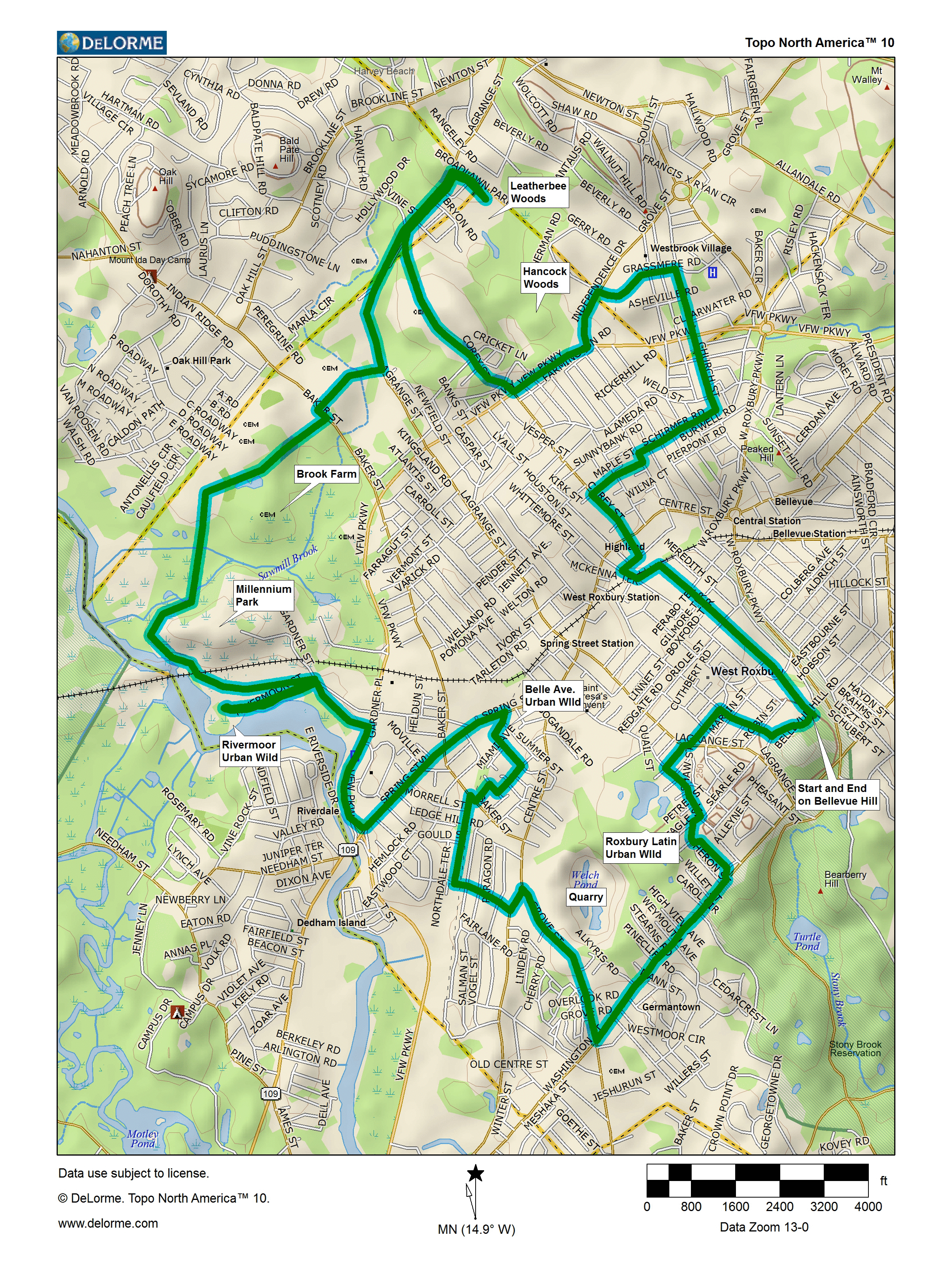 CarFind your way to Bellevue Hill Rd. either from Lagrange St., the next light south of the summit of the hill on Washington St. or Clement Ave., which parallels the West Roxbury Parkway and can be entered from Pelton St.Bailout pointsCentre and Spring St. buses have bike racks. |